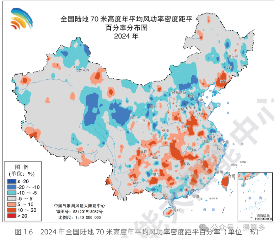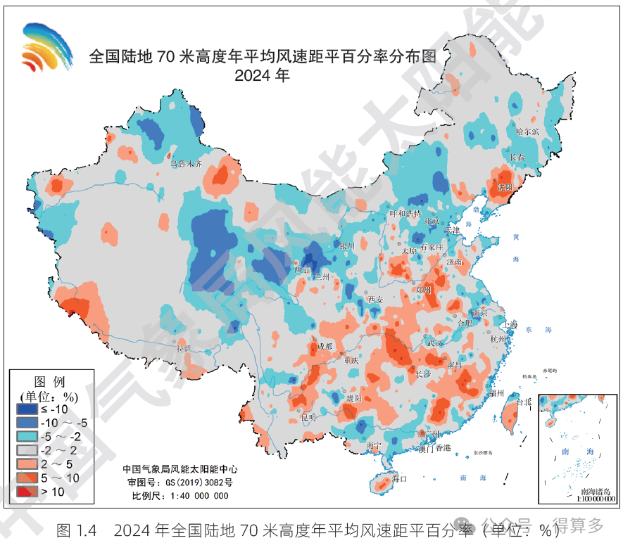 青藏高原和云贵高原的山脊地区等地超过300W/m²。我国其他地区年平均风功率密度一般低于200W/m²,其中中部和东部平原地区及新疆的盆地区域低于150W/m²。与近10 年相比,北方大部地区正常或偏小,南方大部地区正常或偏大(图1.6)。具体情况如下: