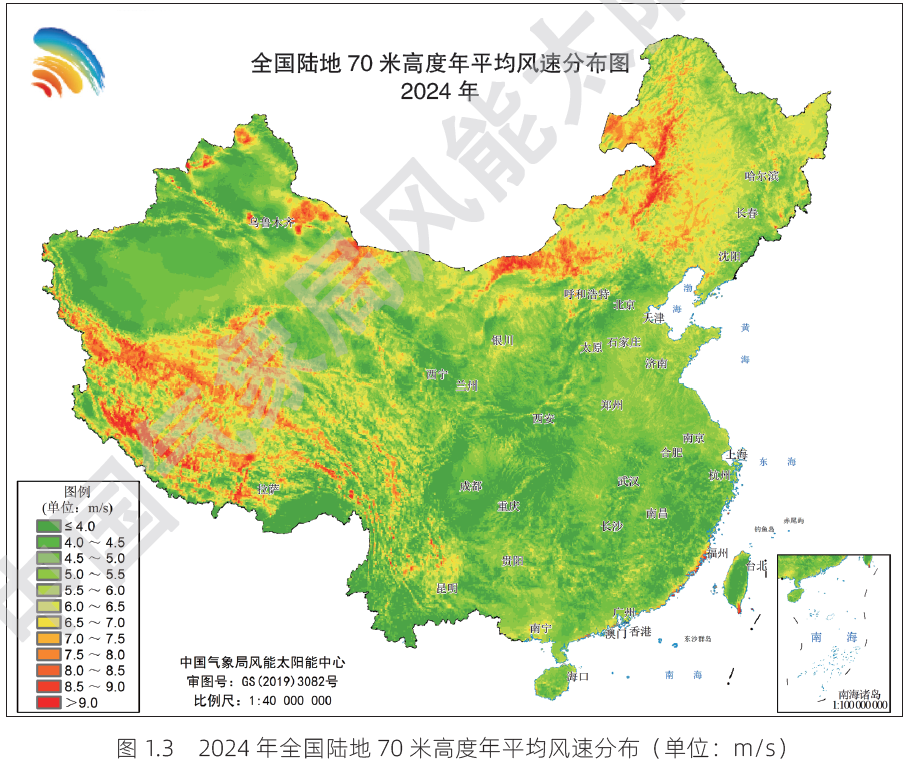 2024 年,我国70 米高度平均风速均值约为5.4m/s。从空间分布(图1.3)看,东北大部、华北北部、内蒙古大部、宁夏中东部、陕西北部、甘肃西部、新疆东部和北部的部分地区、青藏高原大部、四川西部、云贵高原和广西等地的山区、东南部沿海等地年平均风速一般大于6.0m/s,其中,内蒙古中部及东部、新疆东部和北部的部分地区、甘肃西部、青藏高原大部等地年平均风速达到7.0m/s,部分地区甚至达到8.0m/s 以上。甘肃南部、山东大部、江苏大部、安徽北部、河南东部、湖北中部、江西山区、湖南山区、广东北部等地年平均风速为5.0m/s 至6.0m/s。我国其他地区年平均风速一般低于5.0m/s,主要分布在中部和东部平原地区及新疆的盆地区域。