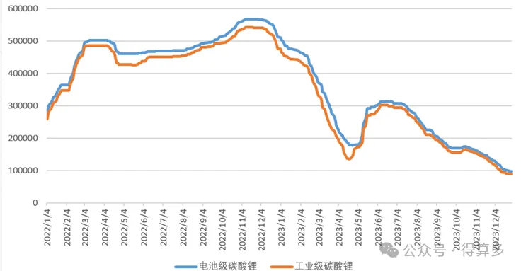 全球新能源汽车增速放缓、储能增速不及预期,导致锂电池、正极材料、锂盐等上游产品消费下滑,叠加上游锂盐等产品产能过剩,产品价格进入下跌浪潮,锂行业由卖方市场转向买方市场,部分锂盐企业出现成本倒挂;同时,自2023年7月21日广州期货交易所碳酸锂期货合约上市以来,对碳酸锂现货市场也形成了较大影响,现货价格整体跌幅约八成。