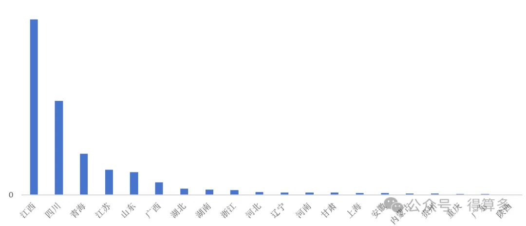 我国锂产品产能区域分布相对比较集中,分布在20个省级区域。其中,江西、四川、青海、山东产能占比最多。