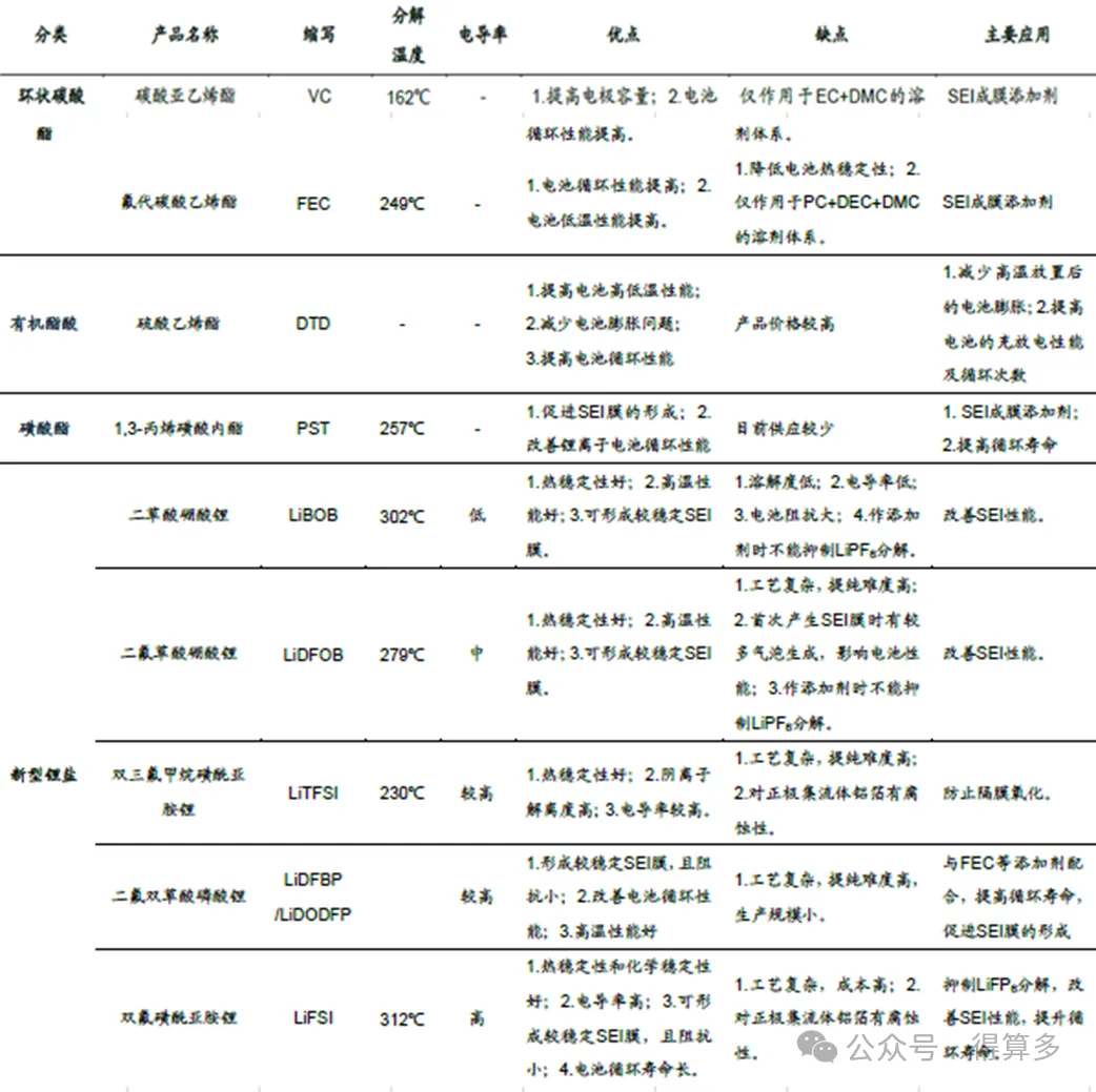 电解液添加剂是电解液的核心技术。在有机电解液中添加少量的某些物质,能够显著改善电池的性能,如电解液的电导率、电池循环效率、使用寿命等,这些少量物质被称为功能性添加剂。添加剂在锂电池电解液中用量很少,一般在5%以下,但作用非常明显,是电解液中必须使用的,号称工业味精。