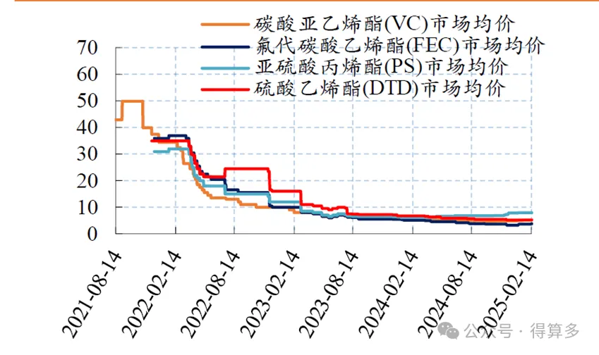 近年来由于下游电池厂商需求量激增,电解液及上游原材料的短缺导致电解液主要原材料电解质和添加剂价格经历了快速上涨。而随着行业新产能的不断投放,行业竞争加剧,锂电池电解液添加剂价格波动明显。