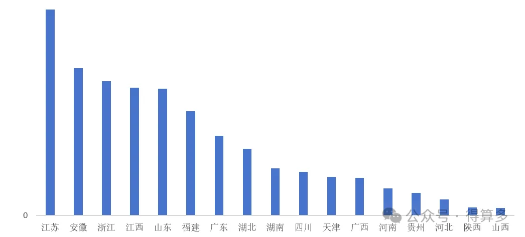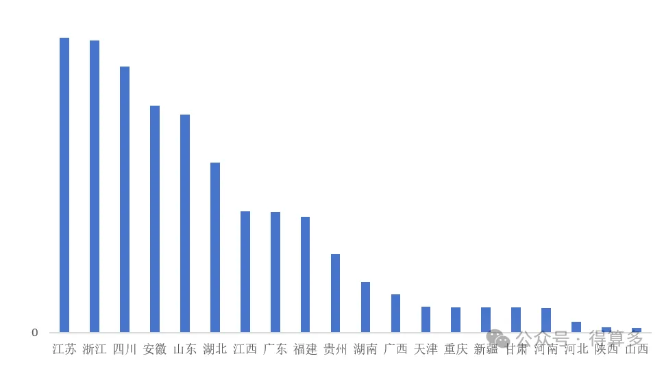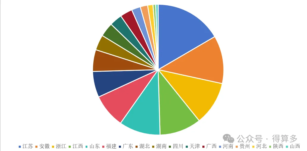 截止2024年,我国电解液产能分布在全国17个省(市、区)。其中,江苏省产能最高,占比16.56%;其次是安徽省,占比11.87%;浙江省位居第三,占比10.83%。前5区域合计占比接近60%。