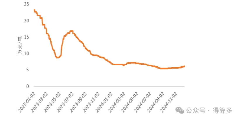 截止2025年2月14日价格为6.15万元/吨,较2025年1月初的6.25万元/吨回落1.60%,短期总体震荡为主,后续须密切关注碳酸锂价格走势。