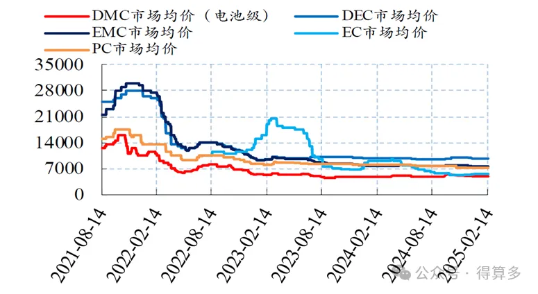 现有的溶剂主要由碳酸乙烯酯(EC)、碳酸丙烯酯(PC)、碳酸甲乙酯(EMC)、碳酸二乙酯(DEC)、碳酸二甲酯(DMC)等碳酸酯类产品构成,具体配比方式将视下游客户的需求而定。