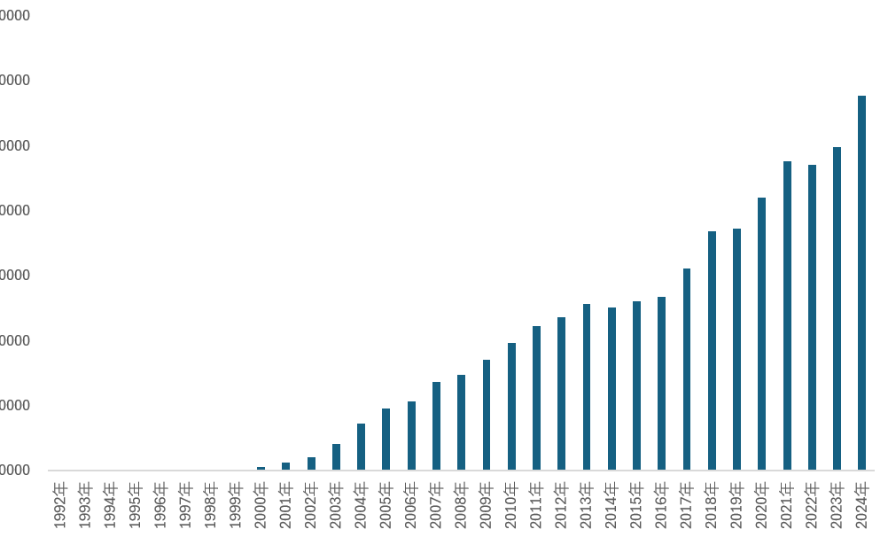 全球各国风电:1992-2024年日本年风电发电量规模走势