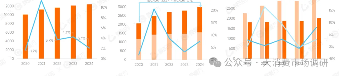 近几年,我国城镇宠物犬猫数量呈现持续增长态势,带动犬猫整体消费市场规模稳步上升。2024年城镇(犬猫)消费市场规模突破3000亿元,增长7.5%,宠物经济处于扩张阶段。尽管犬市场规模更大,但猫市场复合增长率相对于犬市场略胜一筹。