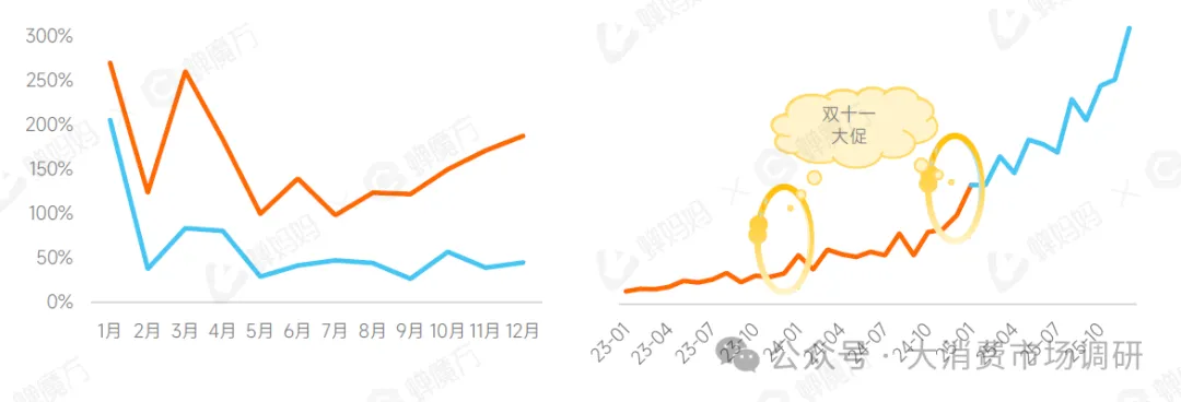 电商营销拉力∶品牌在抖音平台上通过多种方式加大推广力度,增加直播和短视频推广数量,以提高转化率。2024年下半年,推广视频和直播数量的提升明显拉动了GMV增长,说明商家在内容种草和直播带货上的投入取得了成效。