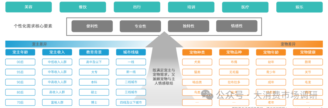 随着养宠人群的不断扩大和消费观念的多样化,不同宠主在年龄、收入水平、生活方式、教育背景等方面的差异,以及宠物种类、遗传、年龄、性格、健康状况等差异的,导致消费者对宠物服务的需求日益个性化和差异化,市场对的期待已远远超越了传统较为单一的洗澡、看病等基础服务,转向了高度个性化与定制化的服务模式。