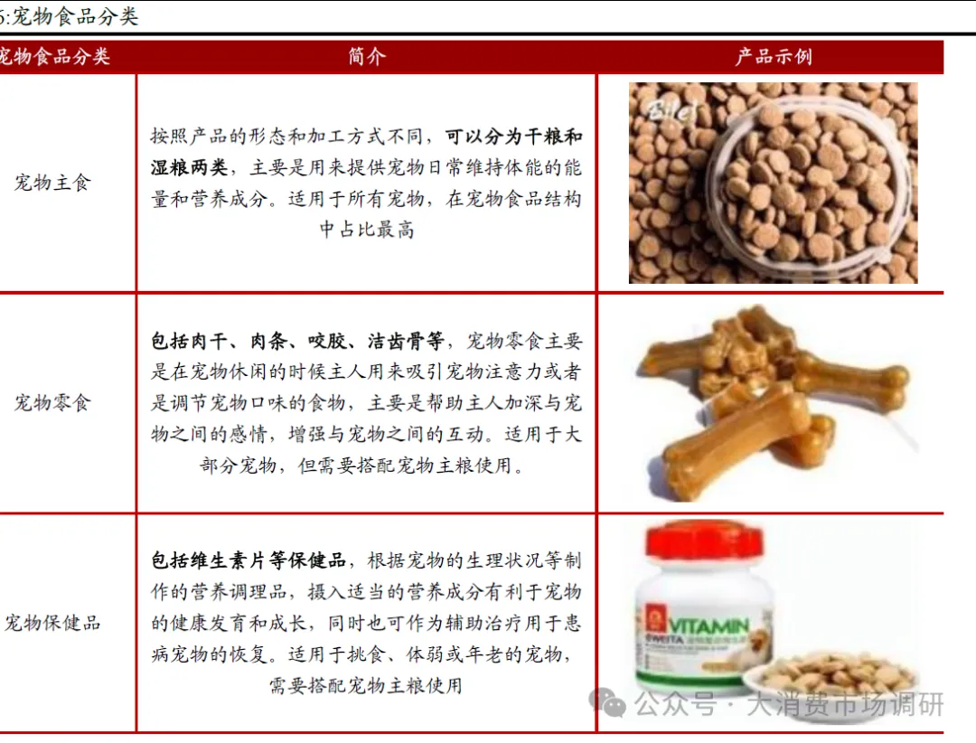 宠物食品可分为宠物主粮、宠物零食和宠物保健品。宠物主粮是指为满足宠物不同生命阶段或者特定生理、病理状态下的营养需要,将多种饲料原料和饲料添加剂按照一定比例配制的宠物饲料,单独使用即可满足宠物全面营养需要,宠物主粮中宠物干粮占比最高。宠物零食通常是指能够补充单一或部分营养素但不追求全面平衡营养,人们为吸引宠物注意力、调节宠物口味、加深人宠之间感情、增强人宠互动、协助宠物训练所需要的产品。如冻干零食、烘干零食、风干零食、零食湿粮、咬胶、洁齿骨等。宠物保健品为满足宠物各生命阶段及其生理需要而制作的营养补充剂,补充和强化单一或多种营养素,以利于宠物的健康发育和成长。