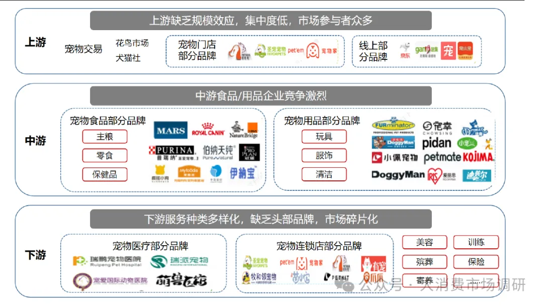 近年来,宠物行业产业链逐渐清晰、完善,子行业种类日益丰富。宠物行业主要包括宠物饲养、宠物交易、宠物食品、宠物用品、宠物医疗、宠物美容、宠物训练、宠物保险以及宠物殡葬等一系列商品和服务链条,各部分具有各自独特的行业特点,已分别发展成独立的子行业。随着宠物行业需求的不断延伸及开拓,宠物商品及服务的种类日益丰富,已发展成覆盖宠物生老病死、衣食住行的完整产业链。1)上游:宠物饲养交易为主,多为个人经营,缺少规模化企业;2)中游:包括宠物刚需的食品及用品,赛道内企业规模化程度高且竞争激烈,宠物食品在宠物行业内占主导地位,是行业爆发受益最大的子行业;3)下游:包括宠物医疗、洗美、培训等服务类企业,随消费需求升级细分赛道逐渐增多,个人店铺为主,连锁化品牌仍在发展中。