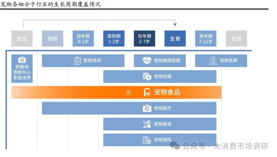 从贯穿宠物一生的消费角度来看宠物行业,宠物行业中各个子行业在覆盖宠物的生长周期、宠物使用频率等方面均有所不同。