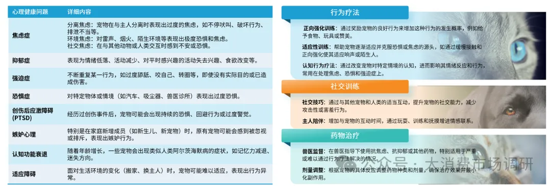 在海外,宠物心理健康服务得到了广泛重视,许多宠物医院和机构提供专业的行为矫正和心理健康咨询。相较而言,由于起步晚和培养体系的缺失,国内专业宠物行为训练师和宠物行为兽医师数量稀少,,导致确诊和治疗宠物心理问题的难度较大。尽管如此,近年来随着宠物经济的快速发展,越来越多的宠物主开始关注宠物的心理健康,并寻求相关服务。
