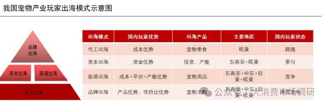 资本出海程度偏低,竞争状态为参与。整体来看,相较于代工业务,资本出海模式的宠物企业数量偏低,海外建厂及收购品牌数量偏少,主要集中在中宠、乖宝以及佩蒂等行业传统头部代工企业。此模式下中国宠物玩家处于参与的竞争状态,我们认为主要由三点原因造成:资本缺位:相较海外成熟市场,国内宠物行业仍是较为初期水平,产业规模偏小,大部分参与者自身营收及产能规模低,企业自身积累的资金规模低,还远达不到大规模出海进行投资建厂或收并购的水平,这种情况下外部资本也难以有所助力;需求缺位:随着国内宠物行业快速发展,国产品牌对代工厂的需求提升,许多代工厂产能开始面向国内企业,出海建厂动力不足;经验缺位:行业收并购及海外建厂等经验少,对应人才储备少,出海仍处于探索阶段。