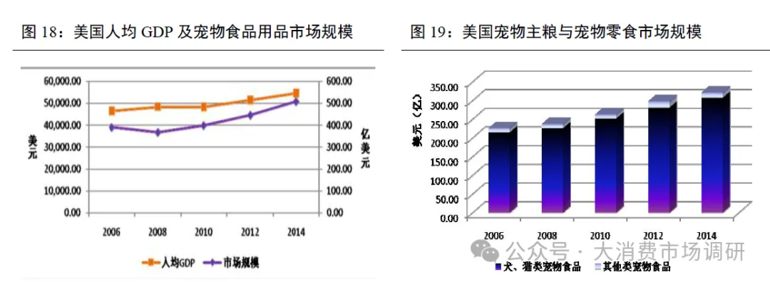 欧美市场为主要消费地区,庞大消费群体带来订单需求。欧美及日本等发达国家是全球主要宠物消费市场,宠物相关产品消费能力强。以美国为例,作为全球最大的宠物饲养和消费国家,进入21世纪,随着人均GDP的提升和犬猫类宠物食品需求的不断提升,美国宠物食品行业市场规模持续增长,2006年至2014年期间年均增长率约为4.50%。至2014年末,美国宠物食品与用品市场总规模已达507.43亿美元,其中宠物食品市场规模约为321.53亿美元,犬、猫类宠物食品的市场规模约为306.93亿美元,占宠物食品总规模的95.46%。