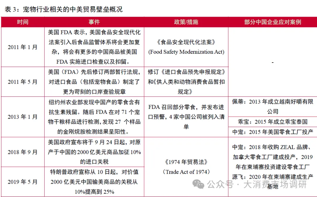 贸易壁垒不断升级,国内宠物企业开始寻求出海途径。2013年抗生素事件发生后,美国FDA迅速撤下相关产品并随后对中国进口宠物零食实施了更严格的检测措施和发布进口预警,使产品入境通关的周期和费用均大幅增加,造成产品成本相应提升,同年我国宠物食品对外出口出现较大幅度下降,同比减少14.59%,且持续下滑至2015年。2018-2019年中美贸易摩擦升级,美国将包括宠物食品在内的价值2000亿美元中国输美商品的关税调整至25%巨大关税成本使得国内宠物企业寻求通过海外建厂、收购境外品牌等方式加快出海步伐。