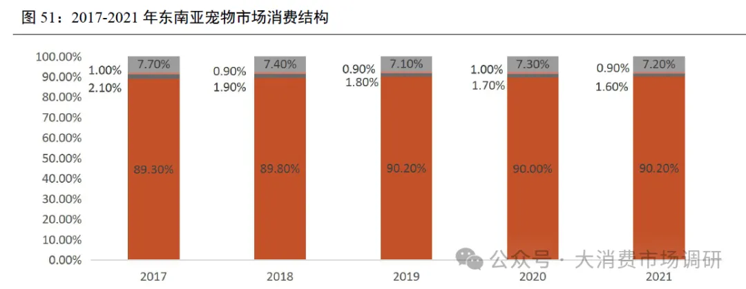 东南亚已成我国宠物食品重要出口地区。根据2022全球宠物市场白皮书引用欧睿统计数据显示,东南亚地区宠物市场消费仍以宠物食品为主,2017-2021年宠物食品消费占比基本维持在90%水平,这主要是由于东南亚地区以发展中国家居多,当地仍以满足宠物初级喂养需求为主。随着东南亚国家经济持续发展,其对宠物食品需求也不断提升,我国向东南亚国家宠物食品出口量实现快速增长。2023年,我国向印尼、菲律宾出口犬猫食品数量分别为3.93万吨/3.48万吨,同比增长 3.36%/2.91%,分别排名第1、第3,2015-2023年CAGR分别为106.47%/61.41%。此外,马来西亚(2015-2023年 CAGR=24.26%)及泰国(2015-2023年