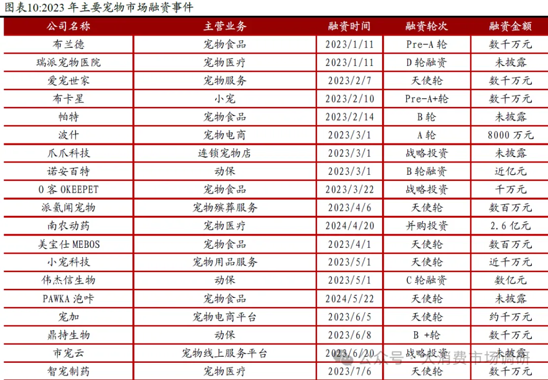 2023年,宠物融资市场中,宠物食品获投6起,宠物医疗获投10起,宠物用品获投7起,宠物服务(供应链、殡葬、电商等)获投5起,其他领域(小宠、连锁宠物店、宠物展会、宠物公益等)获投5起。披露金额的融资事件中,过亿融资3起,分别是宠物家、南农动药,动保企业伟杰信生物;此外还有近亿元融资4起、数千万元融资8起、千万元融资4起。