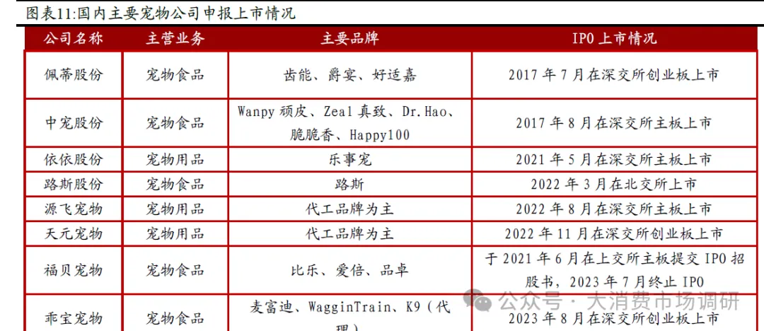 宠物行业近年开启上市潮,目前国内一共有7家宠物主业上市公司。最早在A股上市的宠物公司是2017年7月在深交所主板上市的佩蒂股份,为A股宠物第一股,同年8月中宠股份也在深交所上市3。年此没后有新的宠物行业公司上市,直到2021年开始每年都有新的公司上市,当年5月依依股份在深交所主板20上22市是。宠物行业上市大年,先后有3家企业成功上市:3月路斯股份登录北交所,成为北交所宠物第一股;8月源飞宠物正式登录深交所;11月天元宠物登陆创业板。2023年上市热潮有所降温,只有1家企业成功上市,8月乖宝宠物在深交所创业板上市。此外,2023年7月,曾计划在上交所主板上市的福贝宠物IPO被终止。