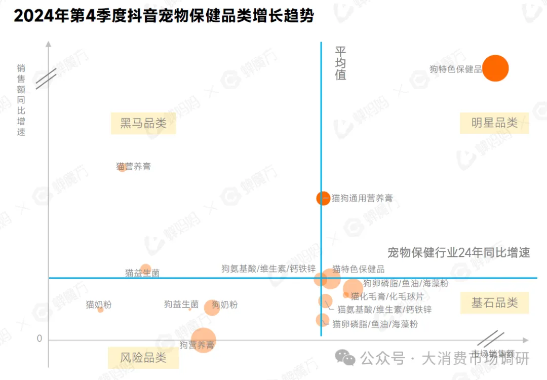 2024年第4季度,宠物保健品品类格局显著分化:狗类保健品强势增长、猫类保健品竞争加剧、通用产品稳定增长。