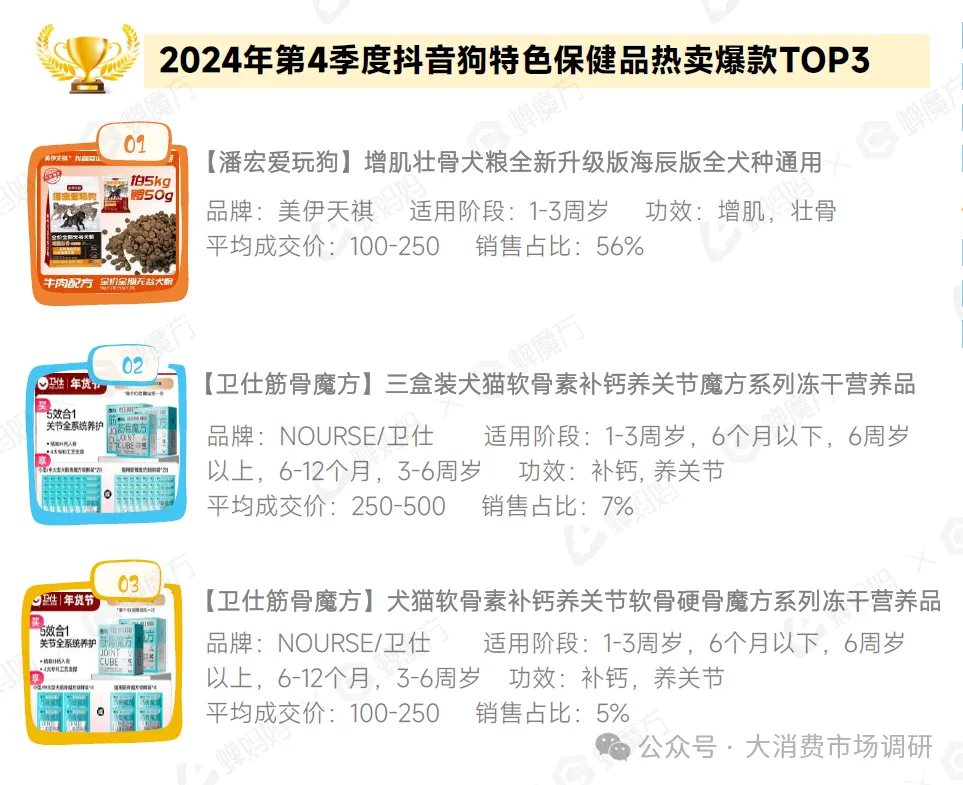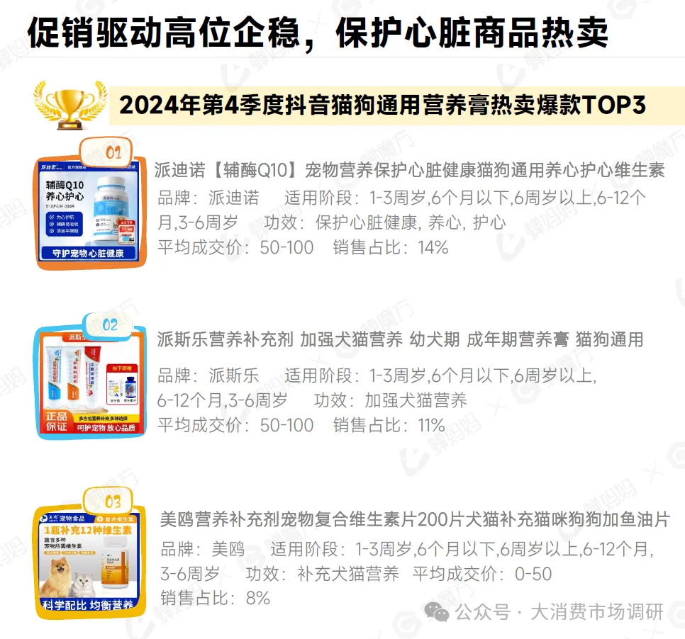 第4季度热卖爆款TOP3中, 冠军商品的功效为保护心脏健康,是细分领域的营养膏,GMV第2名和第3名商品的功效均为加强犬猫营养、补充犬猫营养,是普适性营养膏。