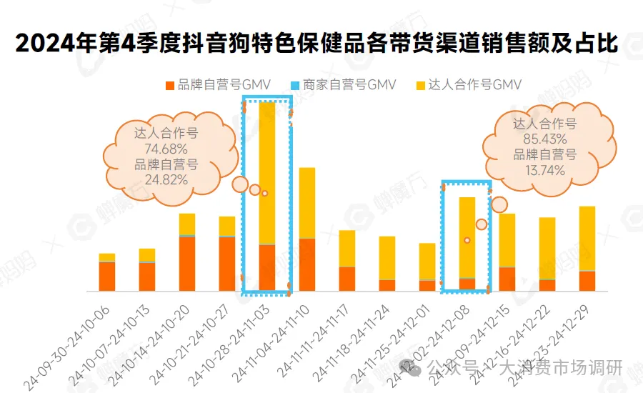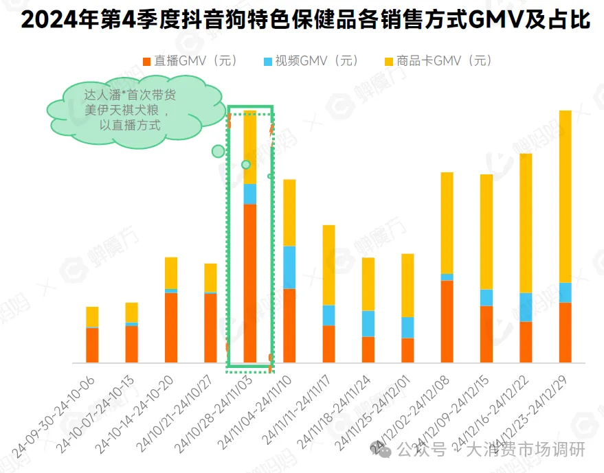 2024年第4季度初期,抖音平台上的狗特色保健品GMV中,品牌自营号占据主导地位。10月底达人潘宏带货美伊天祺犬粮,依托美伊天祺犬粮的头部地位,带动达人合作号快速崛起,取代品牌自营号成为核心带货渠道,其中达人直播是最主要的销售驱动力,尤其是在大促期间,对冲动型消费者的吸引效果尤为显著。