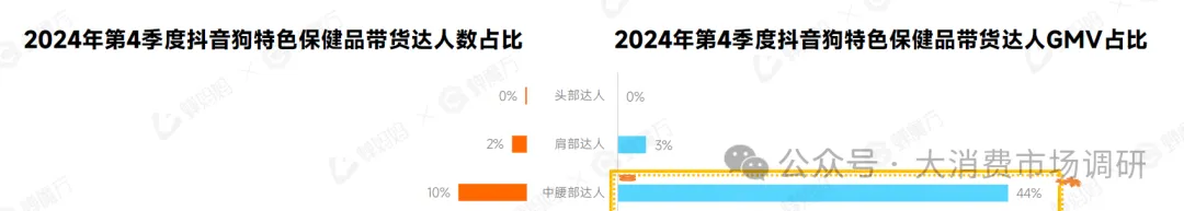 效能反转:头部达人和肩部达人的GMV贡献有限;中腰部达人人均GMV贡献较大;小达人贡献51%的GMV,而其数量占比仅27%,转化率表现突出;尾部达人虽然人数最多,但GMV贡献仅位居第二,险超中腰部达人,主要依赖庞大的达人基数进行长尾销售,人均带货能力有限。