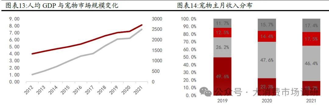 国内经济的发展和人均GDP的增加带动宠物消费需求扩张。根据发达国家宠物行业发展经验,各国宠物行业渗透率与人均GDP呈现出正相关关系。我国已经进入宠物行业快速发展阶段,人均GDP及可支配收入的不断增加为居民消费提供了坚实的经济基础。21世纪以来,我国经济快速增长,家庭收入水平有所上升,根据国家统计局数据显示,2020年我国人均GDP已超过1万美元。生活水平的提高使得饲养者的宠物消费观念逐步转变,对宠物的照顾从满足基本需求逐步升级至提高宠物的生活质量,宠物消费也从食品消费、医疗消费逐步延伸至宠物零食、宠物用品等其他消费,与宠物相关的一些附加消费项目如宠物美容、宠物酒店、宠物培训等也将迎来放量期,横向带动宠物经济规模不断扩大,同时也带动了宠物行业整体的快速发展。宠物不仅仅充当人们感情寄托的角色,也逐渐被当作中国人家庭中重要的成员。宠物消费成为情感消费,相比物质消费,具有更大的需求空间和可持续性。