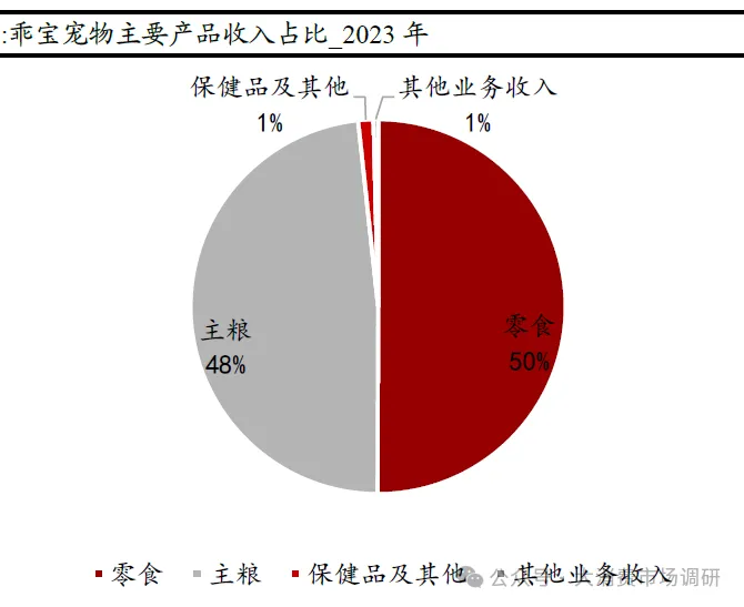 主营产品:专注宠物食品,宠物主粮和零食收入各占一半。主营宠物犬用和猫用多品类宠物食品,主要产品包括科学营养配方的主粮系列,以畜禽肉、鱼肉等为主要原料的零食系列以及犬猫保健品系列等。从2023年收入结构来看,零食50%、主粮48%、保健品1%,零食和主粮平分秋色,零食规模略大于主粮。