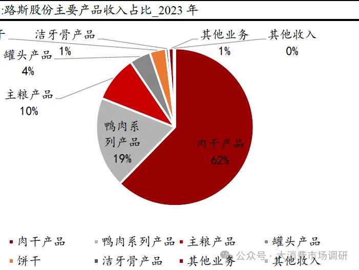 主营产品:专注宠物食品,肉干为主要收入来源。主要产品包括肉干产品、罐头产品、饼干产品、洁齿骨产品、主粮产品、肉骨粉等大类,每个大类下包含丰富的细分品种。从2023年收入结构来看,肉干产品62%,为主要收入来源,其他产品包括鸭肉系列产品19%、主粮产品10%、罐头产品4%、饼干3%、洁牙骨产品1%。