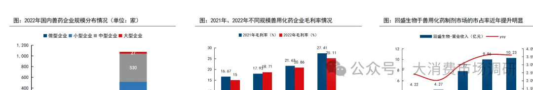 Ø 制剂格局集中逻辑:首先,由于大型兽用化药制剂企业存在规模优势且掌握原料产能,因此毛利率表现明显优于小型企业。其次,养殖规模化程度提升后,大型兽用化药制剂企业在产品矩阵、配套服务和渠道对接等方面的竞争优势开始凸显。综合来看,回盛生物等头部制剂企业近年正在依靠规模和服务优势不断抢占市场份额,兽用化药制剂行业格局持续优化,2022市场CR10较2021年提升8.37pcts。