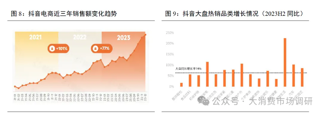 直播等新业态崛起,货架电商强劲增长。根据蝉妈妈数据,抖音平台中直播销售占绝对优势,2023年达人直播/品牌且值市日以ALL1会城必趣电商,将短视频直播和直播的内容场景与+49%/+74%。随着抖音电商2022年升级为全域兴趣电商,将短视频直播和直播的内容场景与抖音商城、店铺等货架场景实现互通,大力投入货架电商建设,2023年抖音商品卡销售额占比13%,同比增长435%,商品卡板块销售增长亮眼。