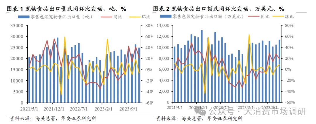 海关总署数据:2023年,我国零售包装宠物食品出口量26.6万吨,同比下降1.2%,出口金额12.26亿美元,同比下降1.5%;其中,12月零售包装宠物食品出口量2.48万吨,同比增长21.3%,环比下滑5.8%,或受11月出口提前备货影响;12月零售包装宠物食品出口金额1.13亿美元,同比增长19.5%,环比增长8.5%,为2022Q3海外客户去库存以来的第5次同比正增长,且实现连续4个月同比正增长。