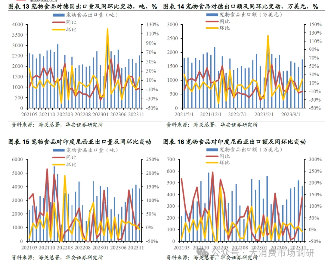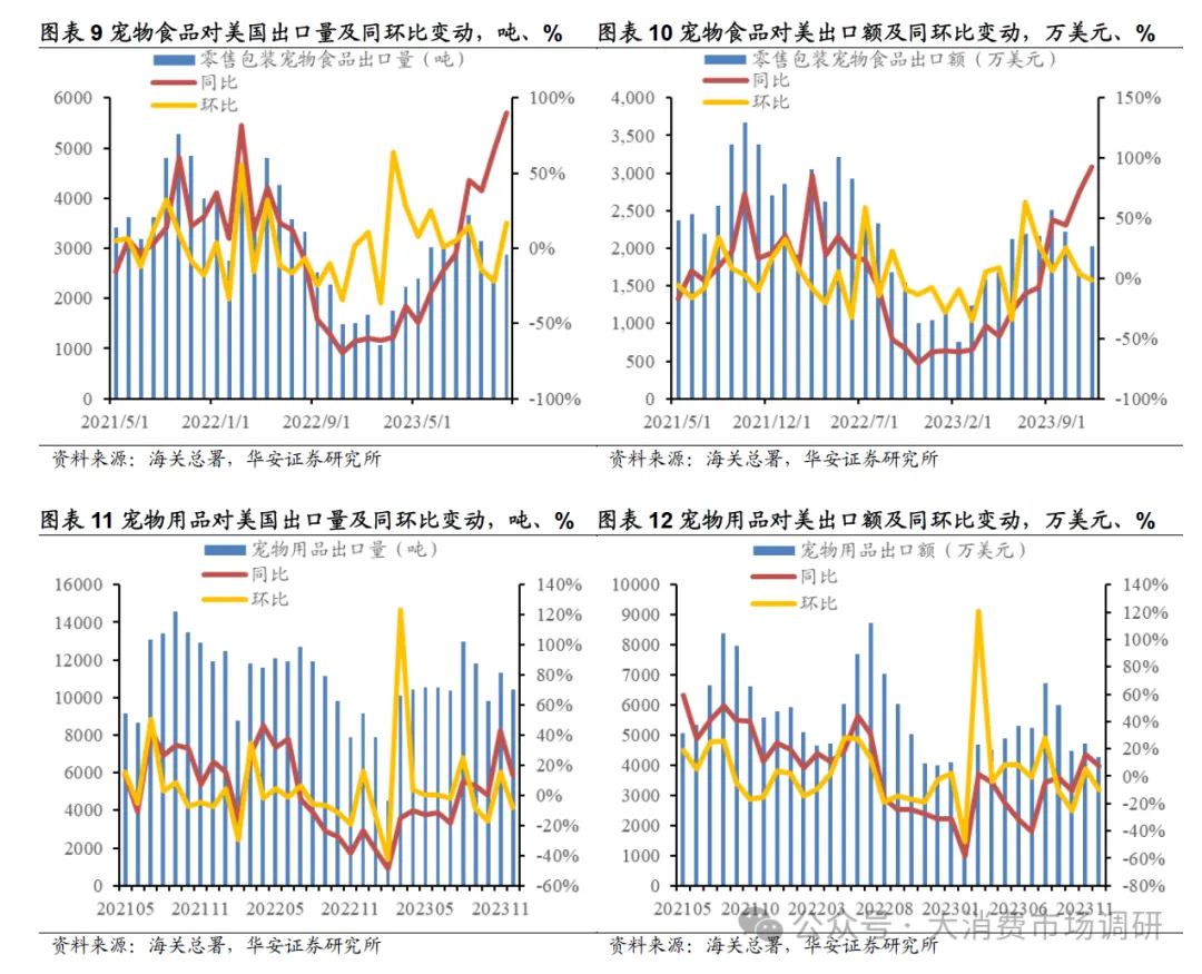 分出口国家看,2023年12月,我国零售包装宠物食品对美国、印度尼西亚出口量和出口金额均实现同比正增长,对德国、英国等部分欧洲地区国家出口量和出口金额同比下降但环比实现增长。其中,12月我国宠物食品对美国出口量/出口金额同比增长90.0%/93.1%,环比增长16.8%/17.9%,连续4个月实现同比正增长,订单回暖明显,但对比2021年同期出口量仍有差距;12月我国宠物用品对美国出口量/出口金额同比增长13.5%/7.3%,环比下降8.1%/9.6%。