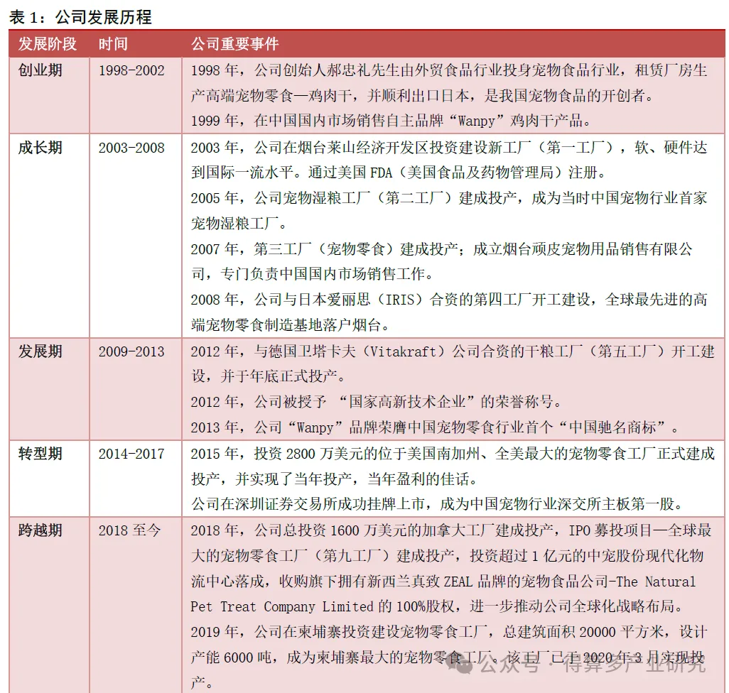 公司是我国宠物食品开创者。公司创立于1998 年,公司创始人郝忠礼先生由外贸食品行业投身宠物食品行业,租赁厂房生产高端宠物零食—鸡肉干,并顺利出口日本,是我国宠物食品的开创者。公司发展至今经历了创业期、成长期、发展期、转型期以及跨越期。公司主营宠物食品的研发、生产和销售,产品涵盖犬用及猫用宠物主粮、湿粮、零食、保健品等品类,每个大类包含多个品种,包括宠物鲜肉粮系列、宠物主食湿粮系列、冻干零食系列、烘焙粮系列、鸡肉零食系列、鸭肉零食系列、牛肉零食系列、鱼肉零食系列、宠物饼干系列、洁齿骨系列等十余个产品系列,总计1000 多个品种。目前公司产品已销往全球五大洲、73 个国家和地区,致力于成为全球宠物食品行业领跑者。