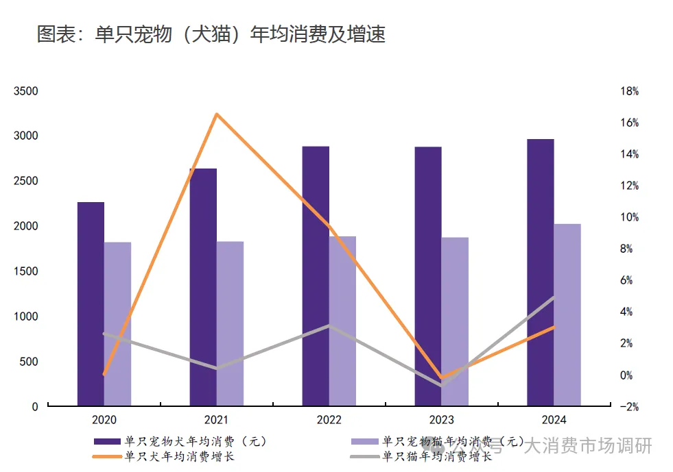 ①价格增速超越数量增长。2020-2024年,中国单只宠犬年消费从2262元升至2961元,单只宠物猫年消费从1818元升至2020元;2024年,单只宠物犬年消费同比增长3.0%,单只宠物猫年消费同比增长4.9%,而宠物数量同比增长2.1%,价格增速已超过同期宠物数量增速,成为市场规模扩张的首要动能。