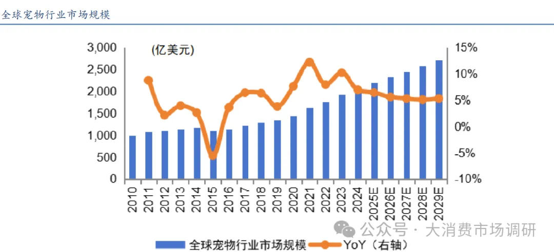 从全球范围看,根据Euromonitor数据,2024年全球宠物行业的市场规模约为2,070亿美元,预计2029年全球宠物行业的市场规模将达到2,708亿美元,2024-2029年复合年增长率预计将达到 5.5%。
