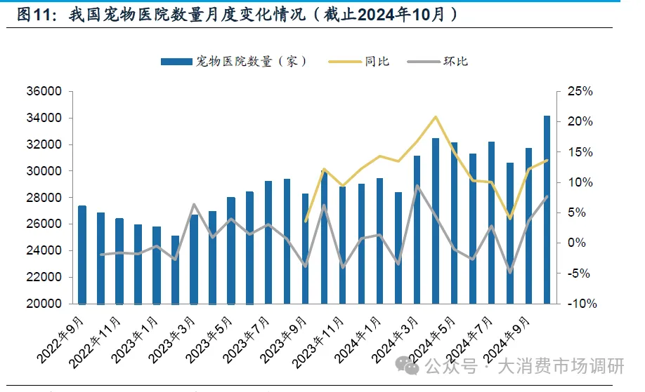 宠物医院为宠物诊疗市场最重要的载体,医院数量整体呈增长态势。宠物诊疗机构包括宠物医院、宠物诊所以及第三方诊断实验室等其他提供诊疗服务的机构,其中宠物医院基于在规模、设备、专业技术等方面的优势,正成为宠物诊疗市场最重要的载体。据Petslib数据,截止2024年10月,我国宠物医院数量为34159家,同比增加13.7%,环比9月增加7.7%,行业呈现积极扩张态势。