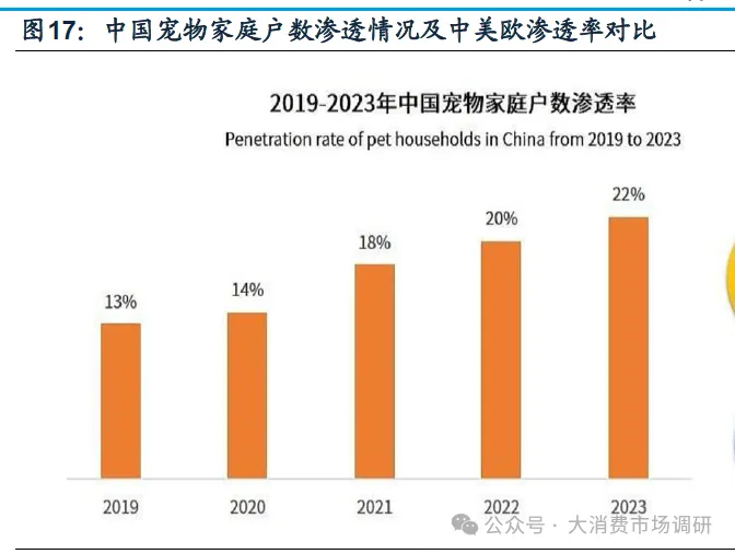 我国宠物渗透率较低,老龄化及单身化趋势下宠物饲养量将持续增加。我国2023年我国城镇犬猫数量为12155万只,同比增长4.3%,其中,犬5175万只,同比上升1.1%,猫6980万只,同比上升6.8%。当前我国家庭养宠渗透率仅22%,相较美国的70%和欧洲的46%显著偏低,基于我国社会老龄化、少子化、单身化趋势,情感寄托和陪伴需求将推动宠物数量长期维持增长。