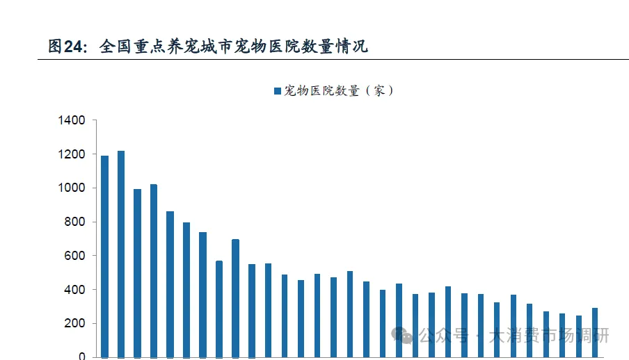 二线城市医疗资源相对紧张,宠物医院存在较大发展机会。据行业白皮书,2023年三线及以下城市新晋宠主增速达到47%,远超一线城市增速,随着低线城市宠物饲养量快速提升,对宠物医疗需求将随之显现。从医院密度看,2023年一线城市单家宠物医院的宠物覆盖数量约3218只,二线城市单家宠物医院的宠物覆盖量达到7545只,三线及以下城市覆盖量约3063只/家,二线城市宠物医院分布密度较低,主要由于二线城市养宠人群庞大但医院保有量相对偏少,我国二线城市宠主数量占全国的比例达41%,但宠物医院仅占全国的22%,二线城市宠物医院数量存在较大提升空间。