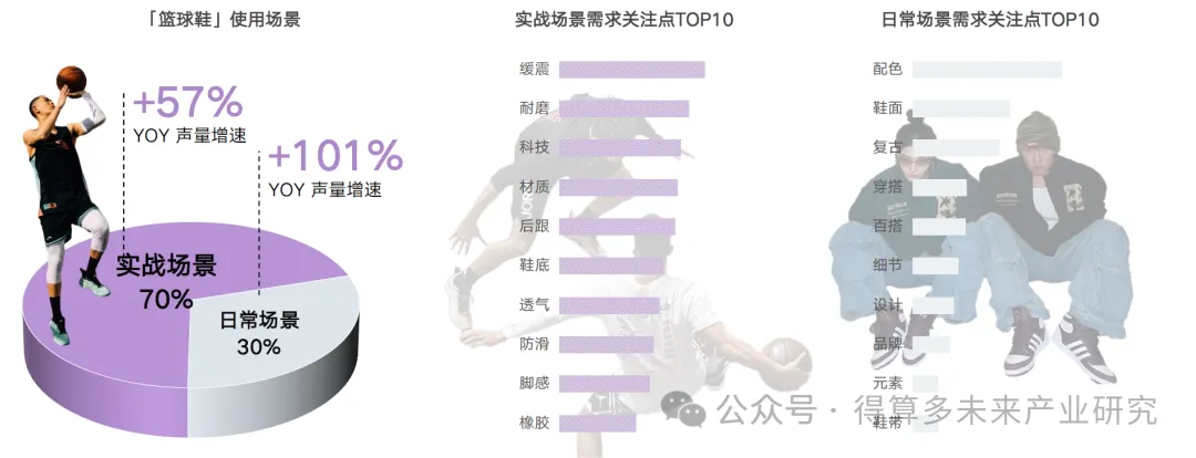 • 实战场景是篮球鞋重点使用场景,声量同比去年增长57%;日常场景声量增速快;