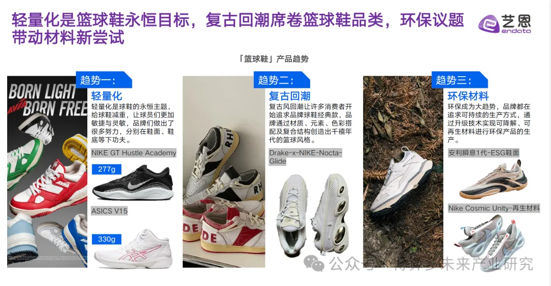 耐克引领篮球鞋市场,安踏增速领先头部品牌,品类潜力突出;古驰篮球鞋品类声量呈现高速增长