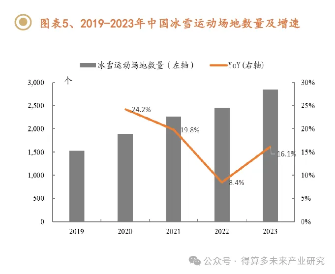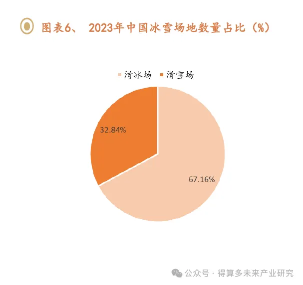 冰雪经济市场规模逐年攀升。我国冰雪运动逐渐普及,冰雪旅游热度持续升温,“冷资源”正在加速转变为“热经济”,冰雪产业规模实现快速增长。根据中商产业研究院发布的《2025-2030年中国冰雪产业专题研究及发展前景预测评估报告》显示,中国冰雪产业规模从2020年的5,000亿元迅速扩张到2023年的8,900亿元,年均复合增长率达21.19%。从各场地类型数量占比来看,2023年国内冰雪运动场地共2847个,同比+16.11%;滑冰场地和滑雪场地分别占比67.16%和32.84%。