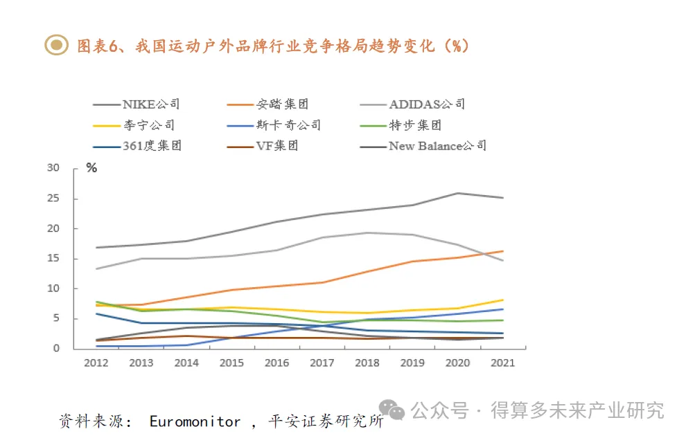 “新疆棉”事件后,本土品牌热度攀升,撬动外资品牌市占率。根据Euromonitor数据,2021年安踏集团市占率跃升至第二,超跃Adidas公司;且李宁公司市占率位居第四,超过其他外资运动品牌。我们认为,我国消费者对国有品牌的认知空间打开,对本土品牌的接受度提高,扭转了洋货占领市场的行业格局。