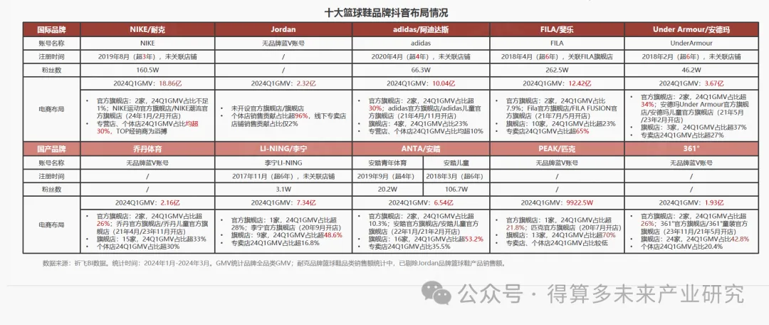 国际品牌:安德玛、斐乐品牌蓝V入驻抖音时间较长,超6年,阿迪达斯、NIKE品牌蓝V入驻抖音超3年,Jordan未开设品牌蓝V账号;从销售表现看,NIKE销售额最高,但官旗贡献度不足1%,主要以经销商店铺贡献为主;阿迪达斯、安德玛官旗销售贡献度均超30%,旗舰店销售贡献占比均超20%,品牌自播表现较好;斐乐官旗贡献占比不足10%,旗舰店销售贡献超2成,线下专卖店贡献度较高,GMV占比超6成;Jordan未开设品牌官方店铺,多以个体店销售为主