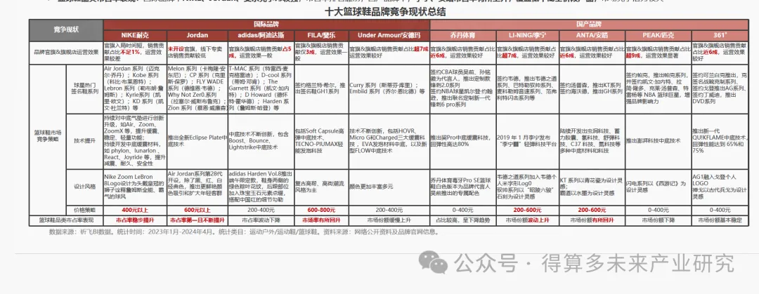 Ø 国产品牌中:乔丹体育以实战为主,面向成人及儿童,包括破影系列、2024春季新款童鞋、磨砺系列等;李宁以实战、潮流为主,包括利刃系列、闪击系列、反伍系列等,推出韦德幻影、韦德全城球星限售支线产品;安踏以实战为主,包括速战系列、KT(汤姆森)系列、三分雨系列等;匹克以实战为主,包括态极音爆系列、态极超轻大三角系列、游侠系列等;361°以实战为主,包括BIG系列、超新星系列、DVD(丁威迪)系列等