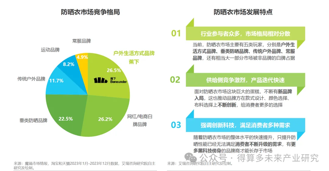 防晒衣市场呈现出多元竞争,形成了以户外生活方式品牌、网红/电商白牌品牌、垂类防晒品牌 、传统户外品牌、运动品牌、常服品牌的6大主流类型竞争的局势。其中,23年户外生活方式品牌蕉下在淘系平台的防晒衣市场占有率26.5%。