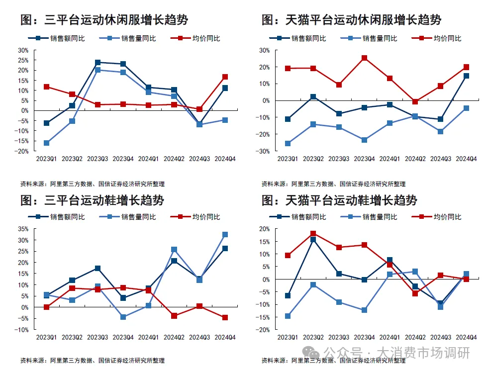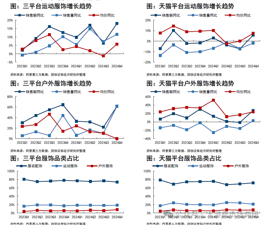 运动服饰、户外服饰均呈现量价齐升的趋势,在2024年线上逐季销售的增速普遍呈现出年初快速增长、第三季度达到年内低点、第四季度明显回升的趋势。运动服饰在三平台合计2024Q4销售额同比+18%,均价同比+5.8%;天猫平台2024Q4销售额同比+5.8%,均价同比+7.4%;户外服饰三平台2024Q4销售额同比+61.7%,均价同比持平;天猫平台2024Q4销售额同比+27.1%,均价同比+23.8%