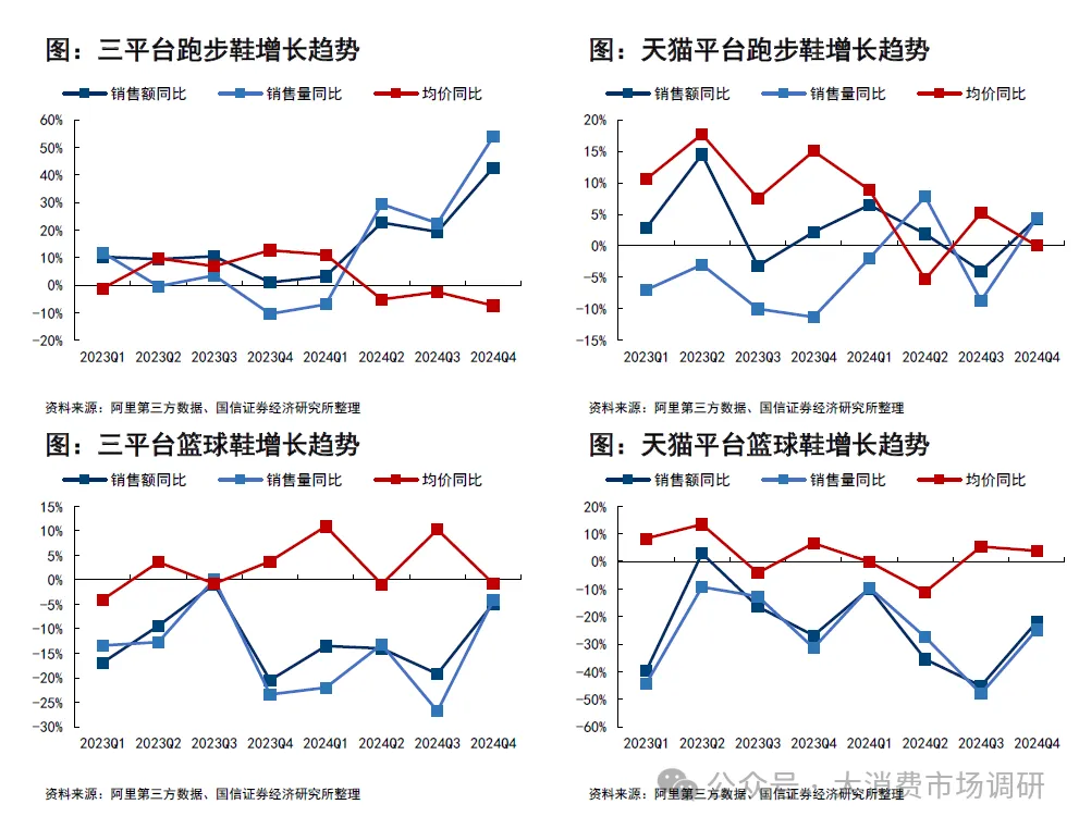 跑步鞋在新平台销量加持下,第四季度销售额大增超过40%,均价小幅下跌。天猫平台销售表现相对平稳。三平台跑步鞋2024Q4销售额同比+42.6%,均价同比-7.4%;天猫跑步鞋2024Q4销售额同比+4.3%,均价同比0%。