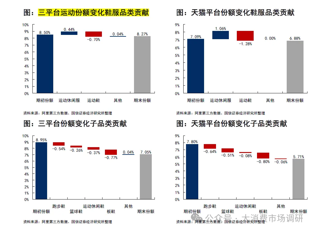 ②运动鞋中,跑步鞋-6.8%、篮球鞋-8.8%、运动休闲鞋+6.4%、板鞋-2.4%。